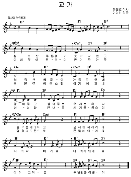 - 동그라미 안의 녹색선은 각각의 개성을 한데 모으는 협력으로 칠보산의 형상이며, 전진하는 진취적인 기상을 나타냅니다.